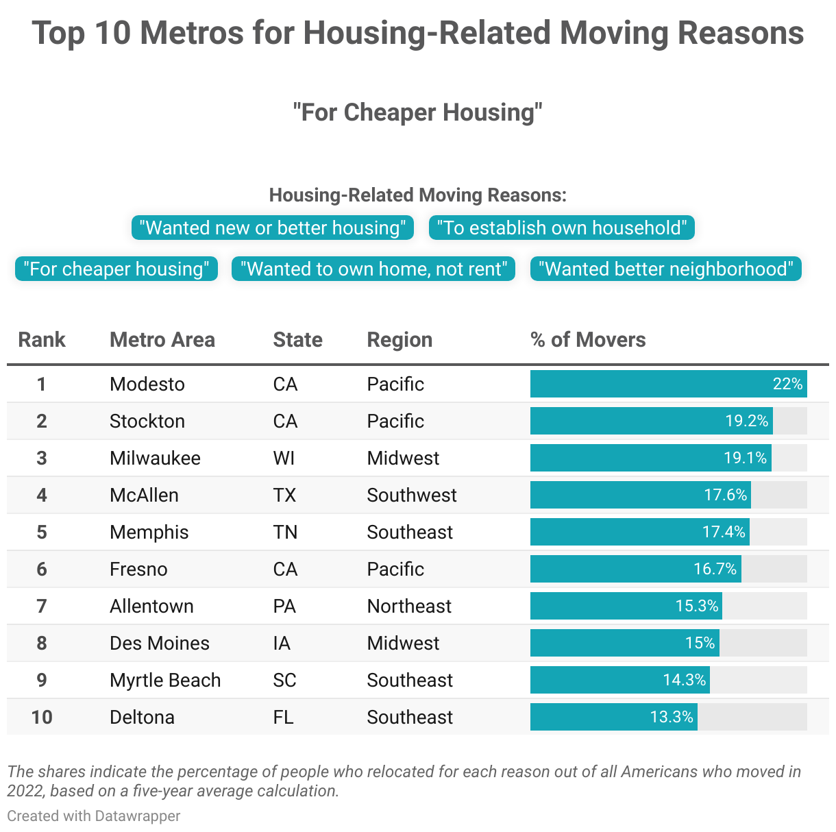 Costs have influenced more and more moves in the U.S. in recent years. But where are these movers finding relief? The West Coast, it seems. Specifically, California metro areas are popular for people seeking cheaper housing. For example, 22% of those who moved to Modesto, CA, in 2022* did so for more affordable homes. Stockton, CA, is next with 19.2%, while Fresno, CA, is sixth with 16.7%. These California destinations all have much lower housing costs than the state average and are close to Sacramento, CA; San Francisco; and Silicon Valley.