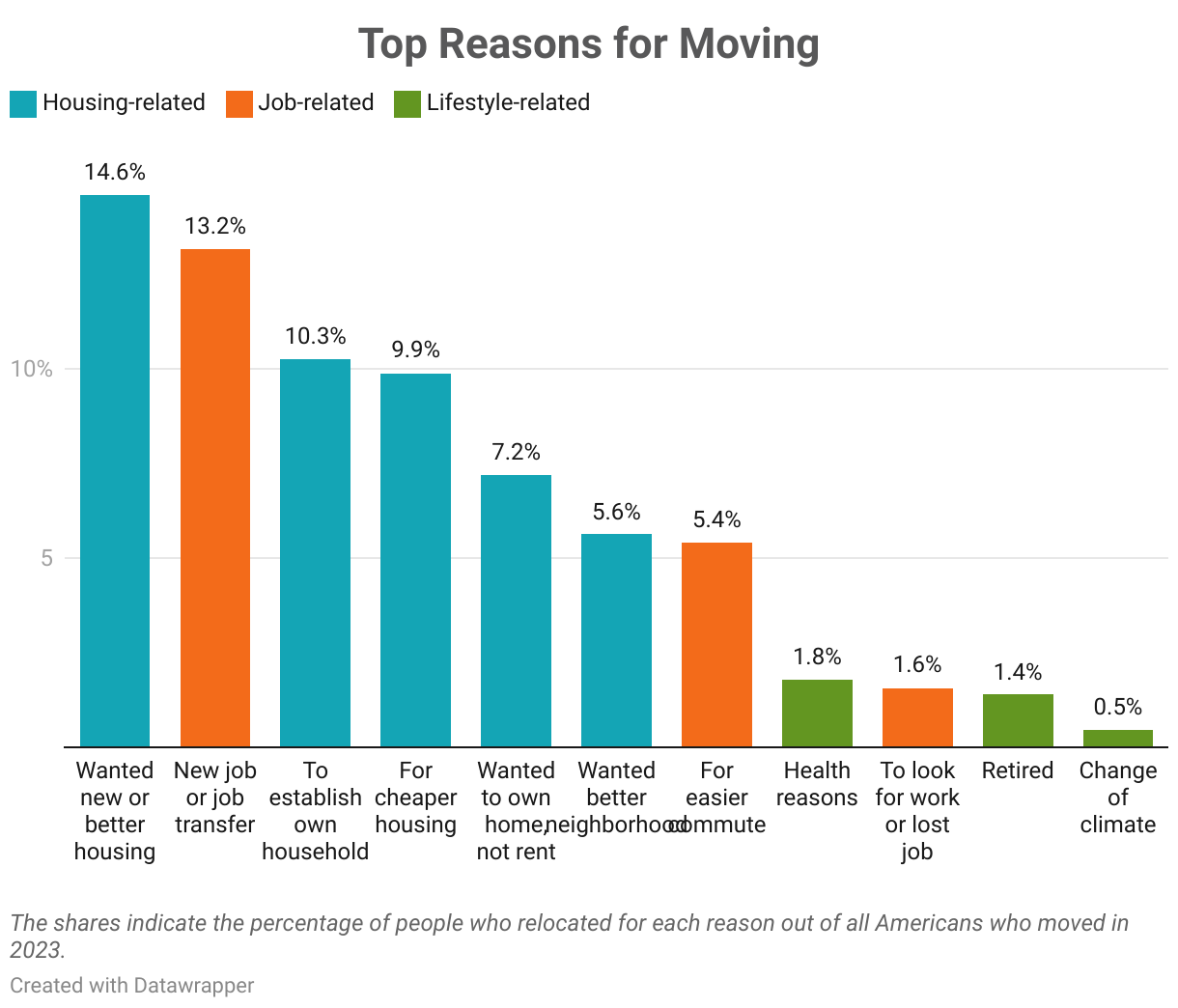 Finally, almost 6% of Americans moved to find a better neighborhood, often a first step towards a better quality of life. More people sought better living after 2020, which coincided with the growth of high-paying tech jobs. Higher incomes allowed more people to focus on improved living conditions.