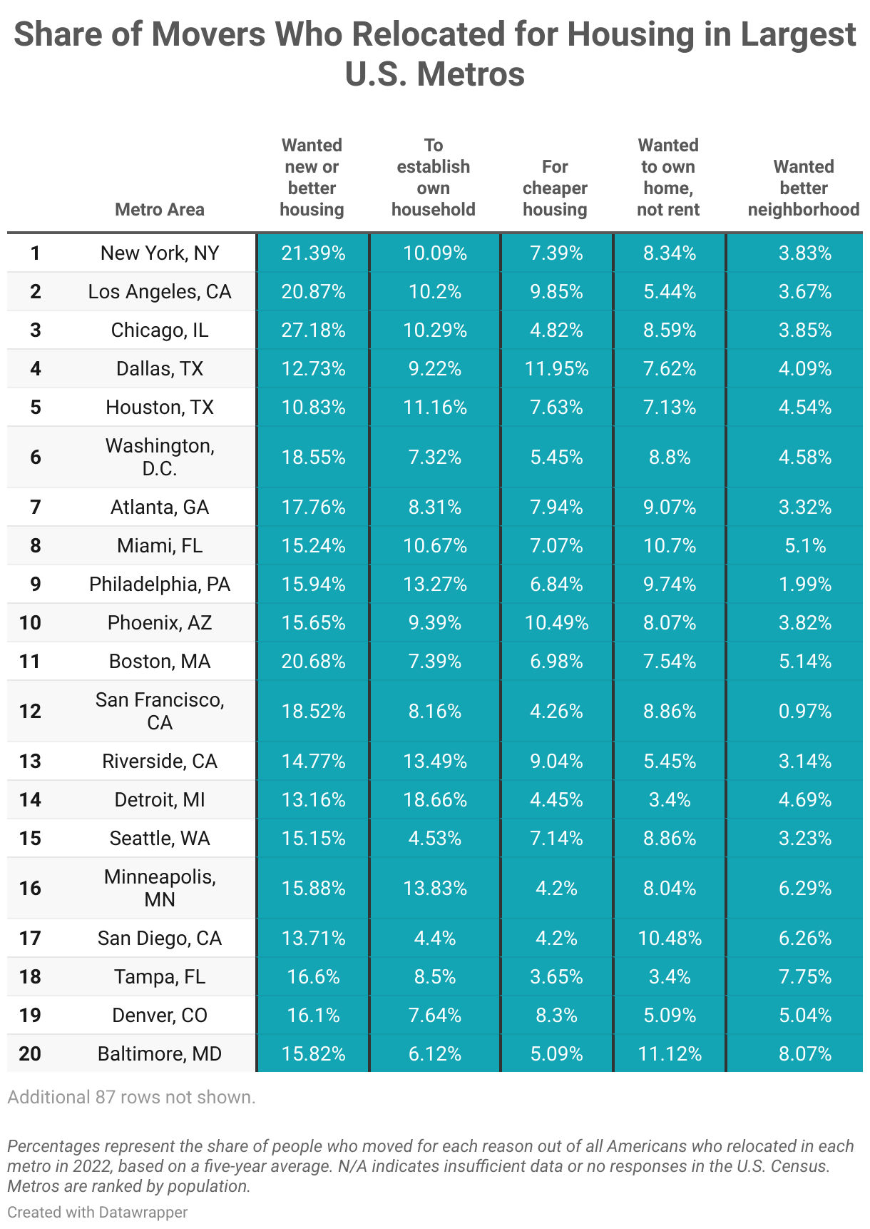 To find out what makes people move in the U.S., we analyzed IPUMS CPS data for 107 metro areas. Our research shows the share of people who changed homes for specific reasons grouped into three main categories: housing, job and lifestyle. In this article, we are focusing on the housing component, the most important motivator for those who change their address.