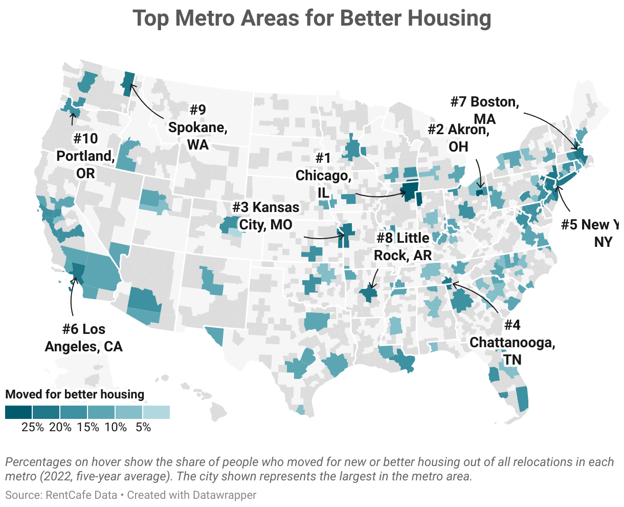Zooming out, the Midwest stands out as a popular region because it offers a good mix of affordable living and quality housing. This is clear from the number of Americans choosing Midwestern metro areas when moving for new or better housing. Besides Chicago, Akron, OH; and Kansas City, MO, are second and third on our list of top metros for better housing with 25.9% and 22.3%, respectively. Remote work has helped boost this trend, allowing people to move to less expensive areas without changing jobs.