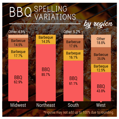 In every region, the most popular choice was the efficient abbreviation: Using “BBQ” saves time and skips spelling differences altogether. This word was employed by nearly 86 percent of the Northeast, and more than 61 percent of the South and Midwest. It was slightly less popular out west, however, where a quarter of folks chose barbecue instead. And in every region, between 12 and 18 percent of residents kept things quirky, opting for “barbeque” instead.