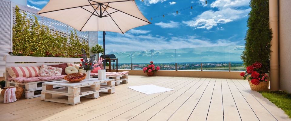 Cozy rooftop patio with pallet furniture lounge zone and beautiful landscape view.