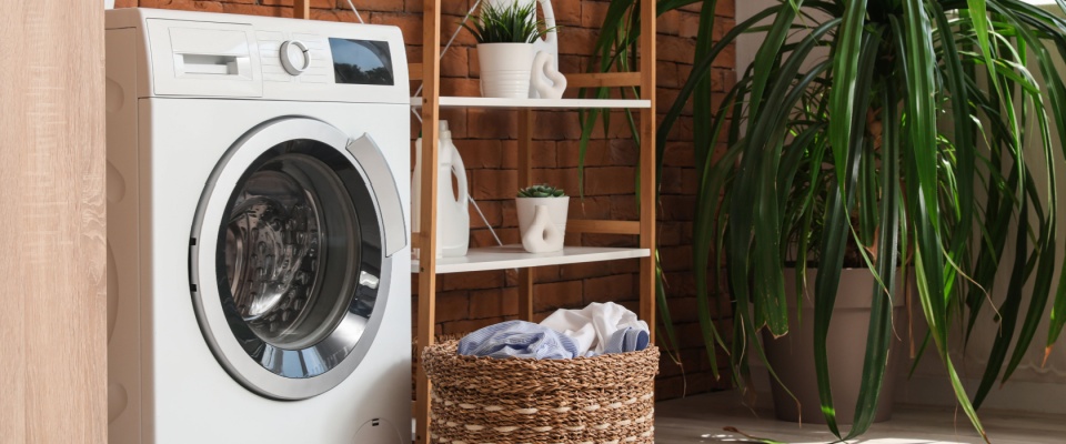 Interior of laundry room with washing machine, basket and shelf unit, an essential on the student housing amenities list.