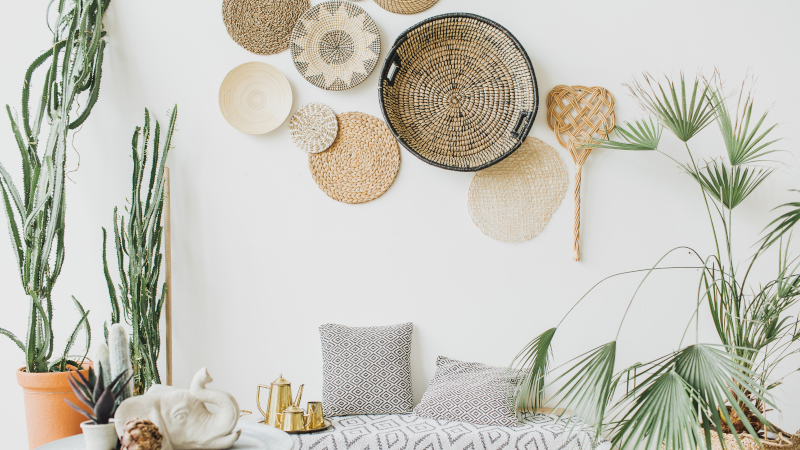 Most of your everyday items can become unique decor pieces with a little bit of creativity. The easiest way to revamp a room with things you have lying around your house is to hang them on your walls or display them on dedicated shelves. Hats, baskets, and plates will look great in most living rooms, along with quirky glass bottles or dishes (that also double as storage!). When it comes to the kitchen, you can display your pots with some stick-on hooks or show off your rustic towels.
