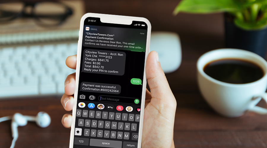 Opt-in for SMS/text alerts on your property’s portal website to take advantage of this fun feature. Once you opt-in, you’ll receive a text for confirmation, you reply Y to confirm, then it will take you through action steps, like type BALANCE to check your balance, PAY NOW to pay your balance and confirm your payment in a couple of easy texts.