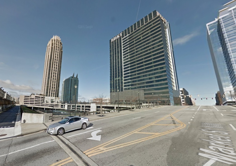 In the background is The Atlantic, a luxury condo and apartment high-rise with an art deco design. The 46-story tower contains 401 suites for residential use up to 3,172 sq ft. In the foreground is the Atlantic Station branch of BB&T Bank, a 25-story skyscraper that opened in 2009. Both buildings have significantly improved the Atlantic Station neighborhood, which was once home to a steel plant.