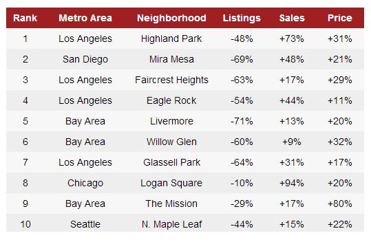 What does this mean for the average would-be Bay Area buyer? Probably bad news, as these numbers are a sign that the boat may have sailed from the few remaining affordable and appealing neighborhoods in the Bay Area. The only reason that a half-dozen other SF neighborhoods aren’t on the list is supply: San Francisco is still coping with record low levels of available housing, forcing those who come to the city to work to look elsewhere for a place to live.