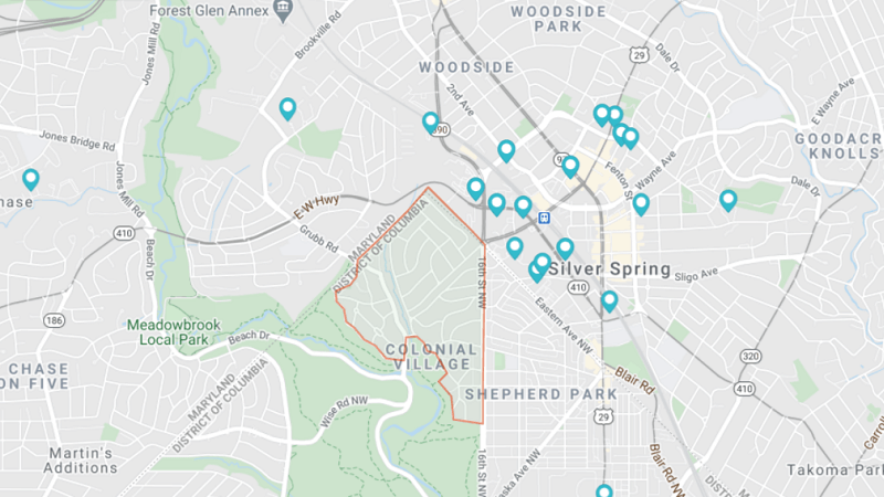 Colonial Village is strictly residential, but there are many things to do nearby. Since it is just across the district line from Silver Spring, Maryland, going there is easy and convenient. There is a big shopping center on East-West Highway near Colesville Road called The Blairs Shopping Center. There are also many small shops in the area such as dry cleaners, Giant Food and Pharmacy, as well as Peet’s Coffee and Tea.