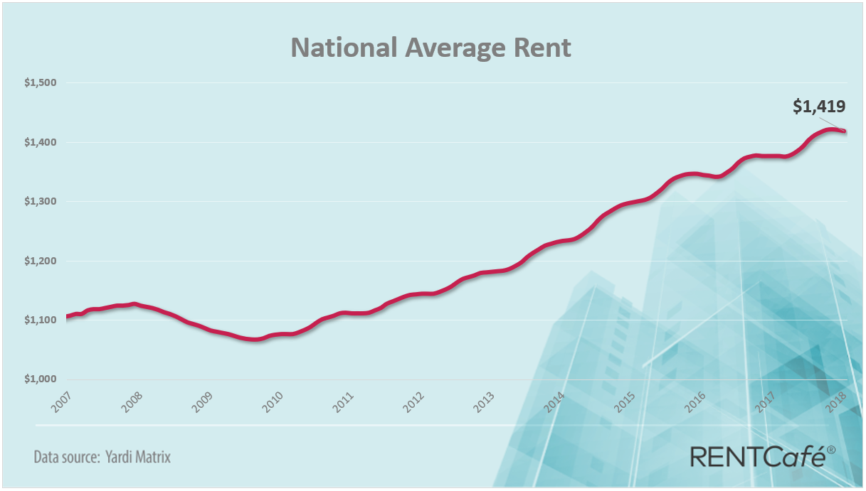Favorable economic factors in 2018 and rising interest rates — which can cause delays in home-buying — pushed the U.S. average monthly rent to $1,419 by year-end, 3.1% or $42 more than at the end of 2017. The cost of renting an apartment started seeing annual increases above 2.5% in February, reached the highest month-over-month growth rate in May (0.8%) and peaked in September at $1,422 according to the latest data provided by Yardi Matrix.