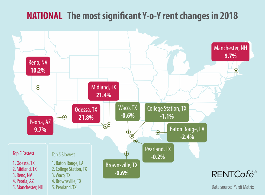 - As of the end of the year and throughout 2018, rents have seen the most fluctuation in small cities, with double-digit percentage increases in Odessa, TX, Midland, TX, and Reno, NV.
