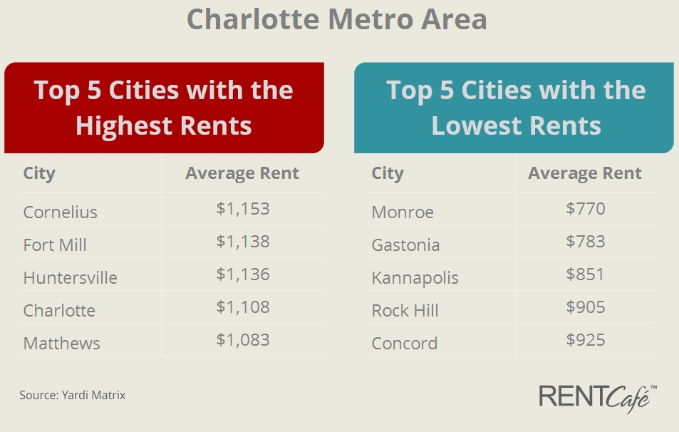A small rental market, Belmont is about to change its motto to: “Welcome to Belmont, NC, where Southern charm rent prices blossom.” The average rent prices went up 11% last year, reaching and exceeding the $1,000/month milestone ($1,007), to become the only town in the Charlotte area to post a double-digit growth in 2016. The city has added only a couple of hundred of new apartments in the past year.