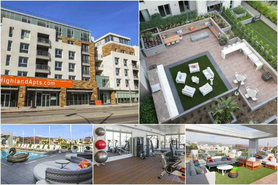 Property description: The Highland offers brand new apartments in Hollywood’s Highland and Sunset neighborhood. Located within steps of entertainment hotspots, with easy access to the Metro Red Line, The Highland includes an amenity package complete with rooftop deck with swimming pool, rooftop lounge with views of Hollywood and DTLA, co-working space, fitness- and training facility, pet park, BBQ areas, as well as an outdoor fireplace.