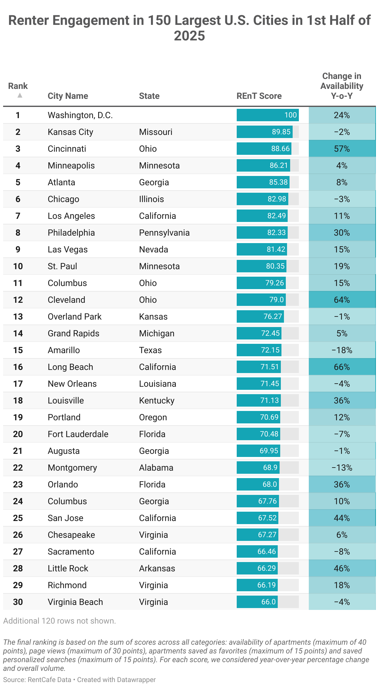 The availability rate score was calculated by the average of the monthly availability rates (dividing the total vacant units at the city level for the most recent month by the total units) in the first six months of 2025 and a year-over-year comparison of the same. The lowest rate received maximum points.