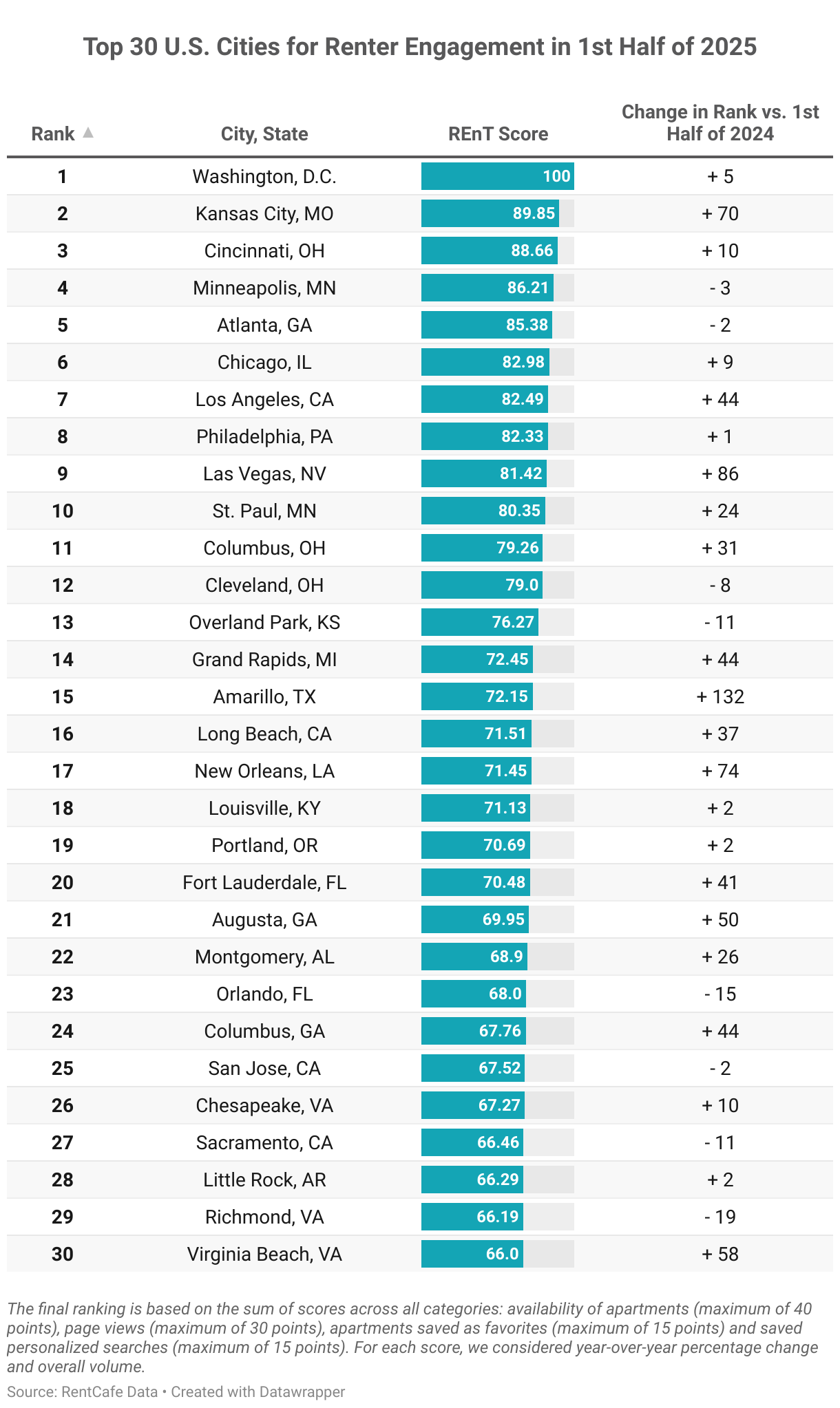 Next, Kansas City, MO, shot up 70 positions in our renter engagement tracker compared to  the first half of last year, to become the runner-up for renter engagement in mid- 2025. Renters are increasingly drawn to KC’s affordability, emerging job market and revitalized downtown.