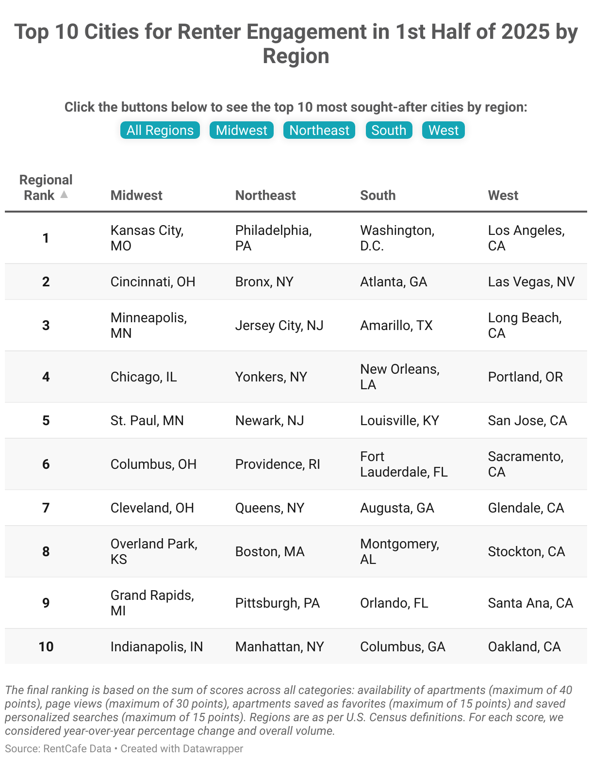 Moving to the Midwest, Kansas City, MO, leads the region for online engagement in the first half of 2025 after a dramatic rise in renter interest. It’s followed by Cincinnati (#2 in the Midwest and #3 in the U.S.); Minneapolis (#3 regionally and #4 nationally); Chicago (#4 in the Midwest and #6 in the U.S.); and St. Paul, MN (#5 regionally and #10 in the U.S.).