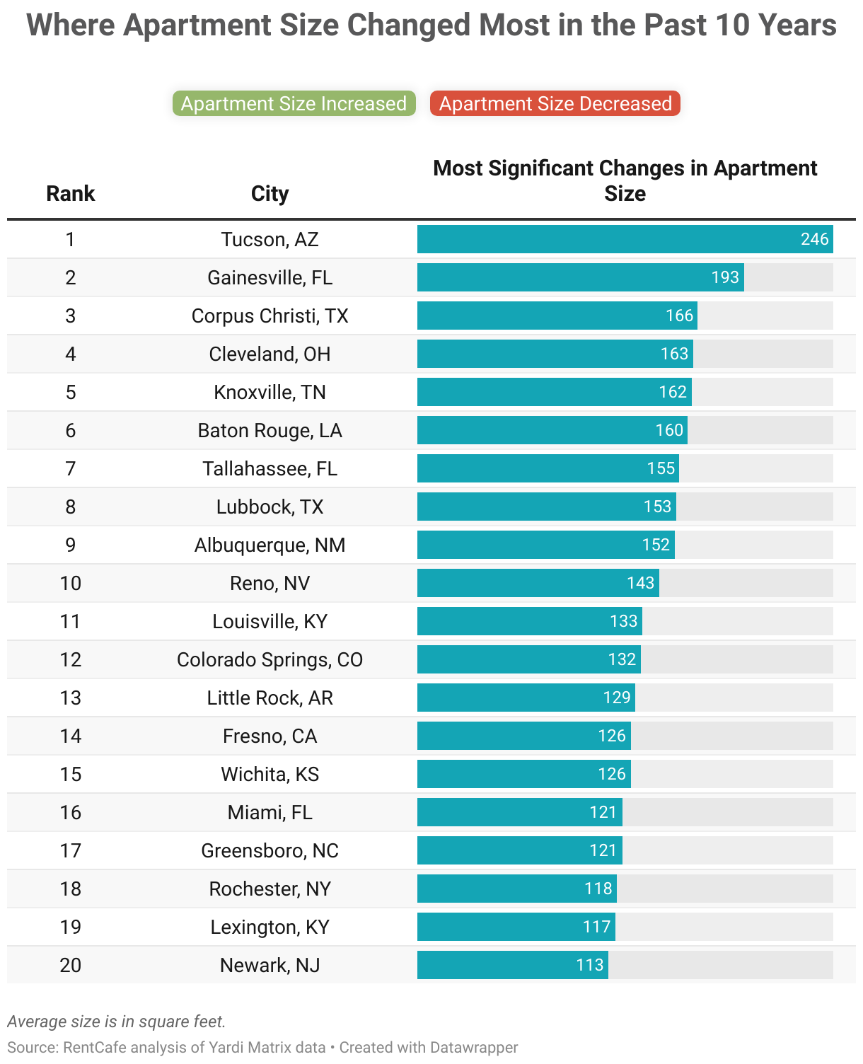 Interestingly, the U.S. cities that offered the roomiest apartments have been building even bigger throughout the last 10 years. For instance, Tucson, AZ, stood out among the top cities for apartment size as the average rental here gained a remarkable 246 square feet — enough to accommodate two extra guest bedrooms. Other cities that similarly reflected this trend included Gainesville, FL; Tallahassee, FL; Baton Rouge, LA; Knoxville, TN; and Lubbock, TX.