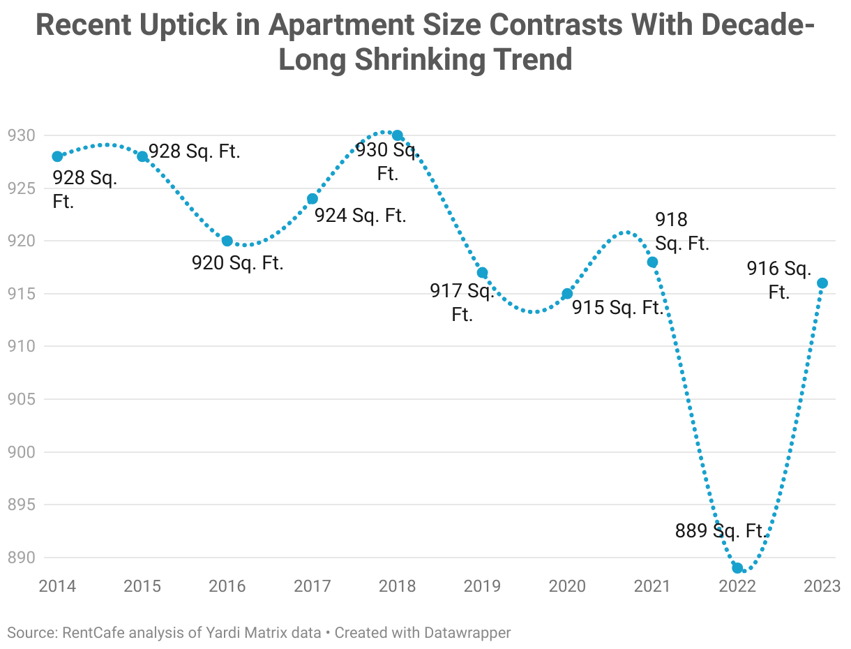 - The average apartment size in the U.S. increased by 27 square feet from the previous year, reaching 916 square feet.