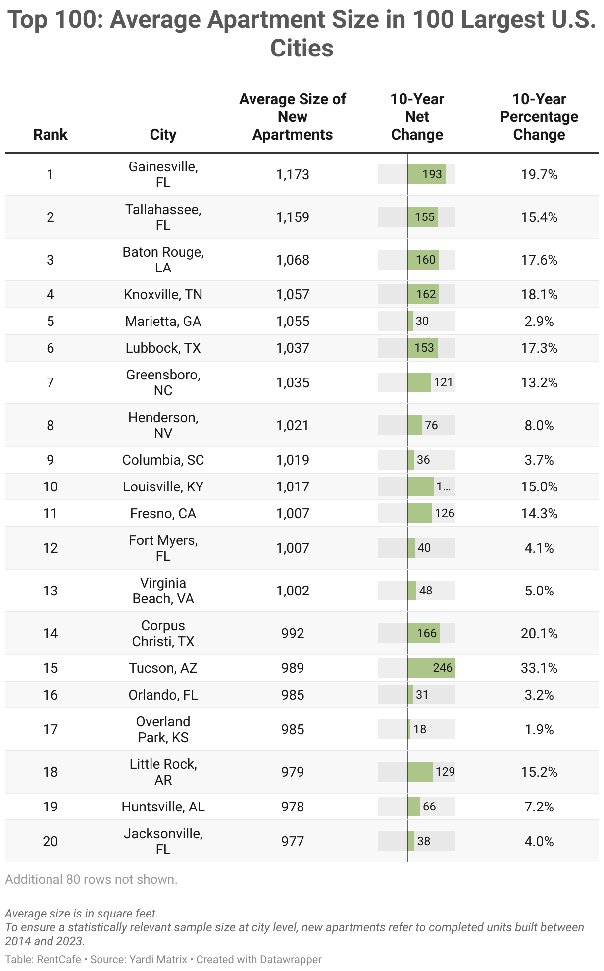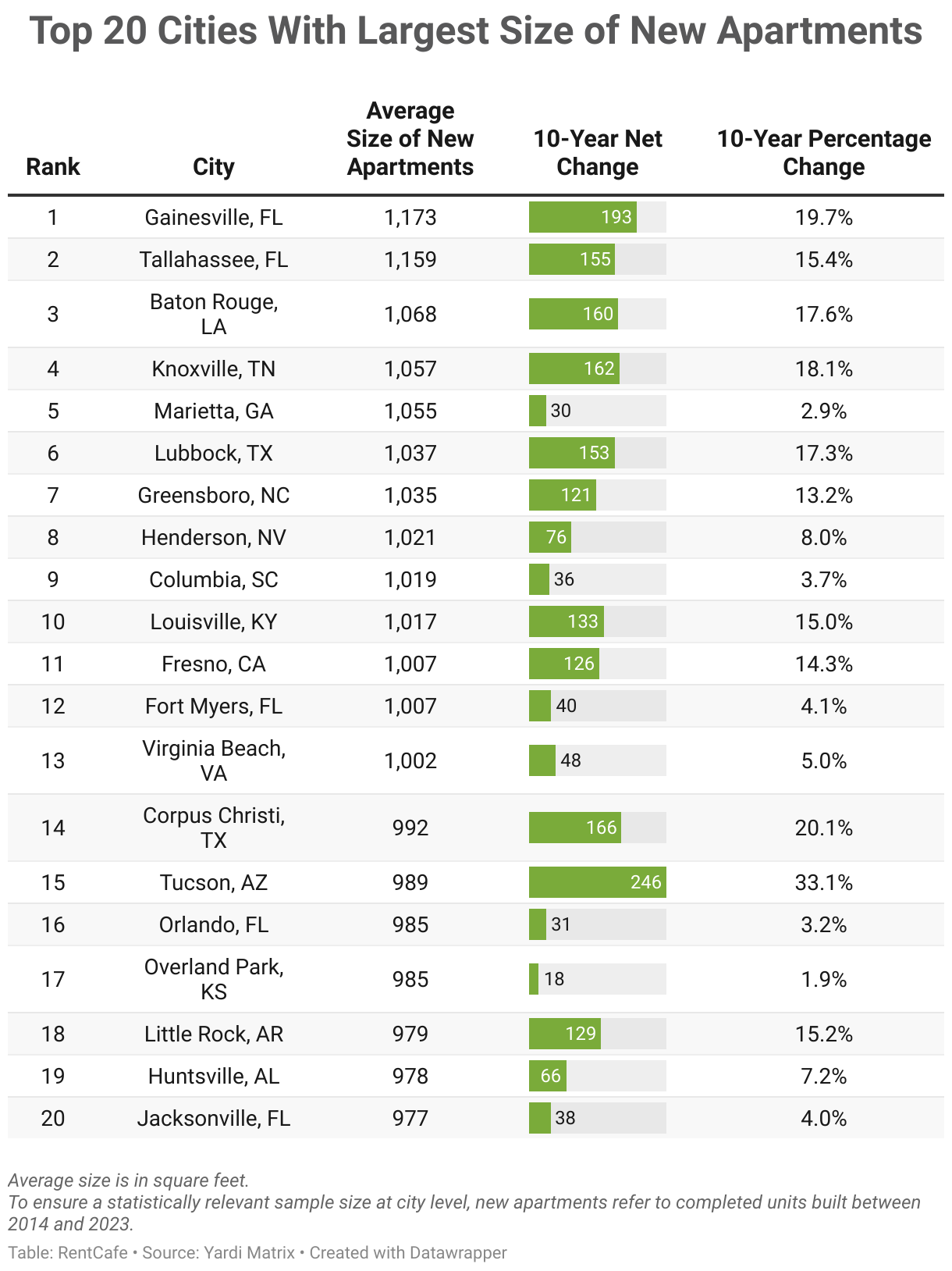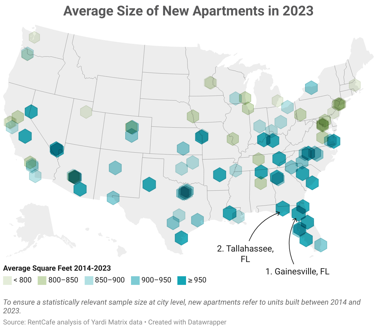 - Florida’s Jacksonville and Orlando were among the top cities with the largest sizes of new apartments, while Seattle led the locations with the smallest units.