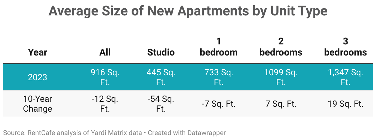 On a brighter note, the two-bedroom apartment — the second-most popular floorplan of the last decade — gained seven square feet and reached 1,099 square feet last year. Similarly, the even larger three-bedroom apartments saw more variations but have been steadily getting roomier: At 1,347 square feet in 2023, this average is now 19 square feet larger than their size a decade ago.