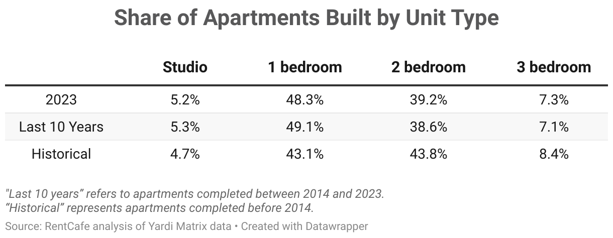 Of course, studios and one-bedroom apartments have been builders’ favorites in recent years as a response to skyrocketing housing demand — so much so that small rentals now dominate the new apartments market with a share of 54.3%. However, if we look at units built before 2014, larger rentals with multiple bedrooms made up 52.2% of all apartment construction.