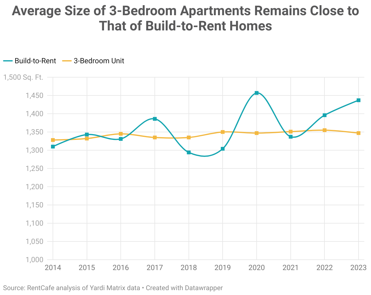 Another interesting point is that three-bedroom apartments have been steadily getting roomier and remain close to single-family homes for rent in terms of floor space and rent costs: The size of a build-to-rent house increased to more than 1,400 square feet in 2023 for an average rent of $2,096, while the norm for a three-bedroom unit was close to 1,350 square feet and $2,160 in monthly rent. This is why, in some locations, renters might find it more convenient to rent a house as opposed to a three-bedroom unit.