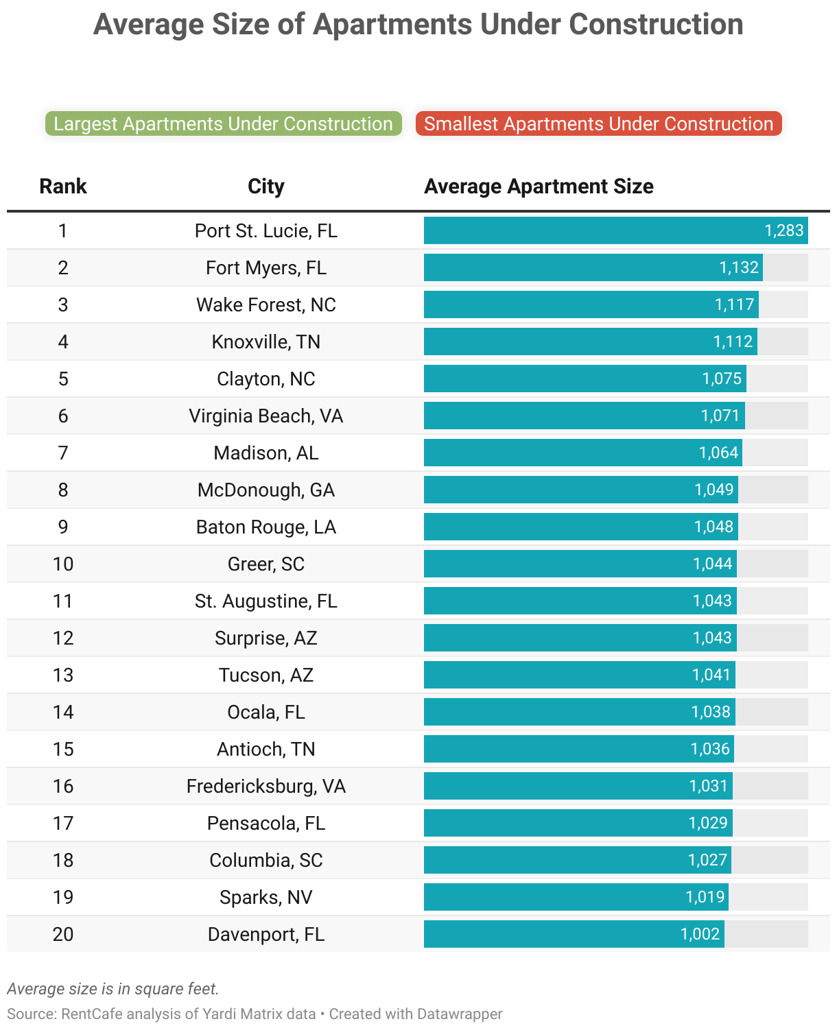 Renters who want more living space and are not in a hurry to move should bookmark the following Southeastern locations, where apartments under construction average more than 1,000 square feet: Port. St. Lucie and Fort Myers in South Florida are the top cities in the nation for the average size of apartments under construction — 1,283 square feet and 1,132 square feet, respectively.