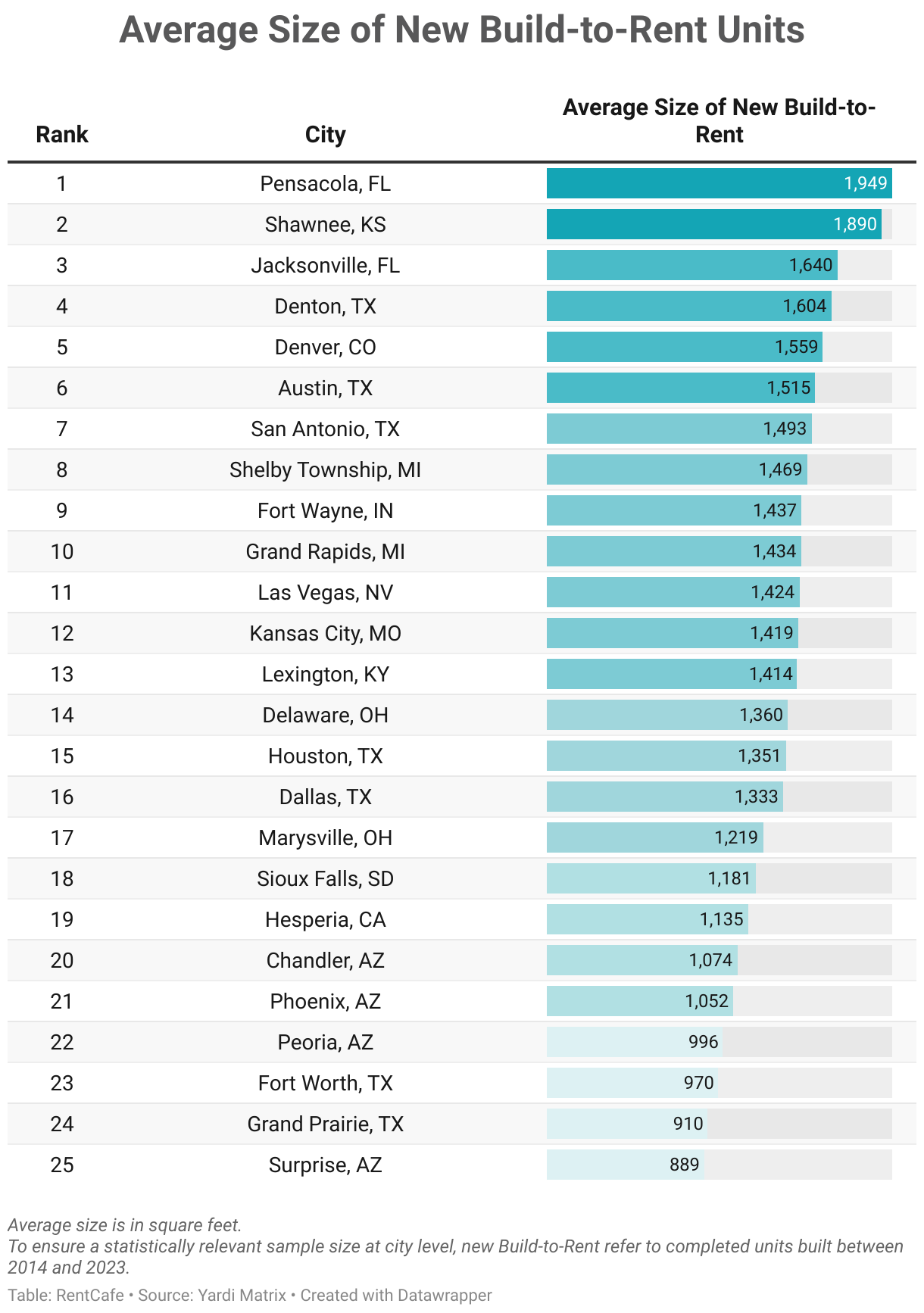 In this scenario, North Florida and suburban Kansas City, MO, offered the most spacious single-family homes for rent — much more than the national average. To be exact, Pensacola, FL, led the way with an average size that was just below 2,000 square feet. Similarly, Shawnee, KS, followed with 1,890 square feet for the typical build-to-rent home. Notably, Kansas City is adding houses for rent at a rapid pace to stand out as one of the Midwest’s top build-to-rent markets. Coming in third was Jacksonville, FL, where the average size of a single-family home for rent was 1,640 square feet.