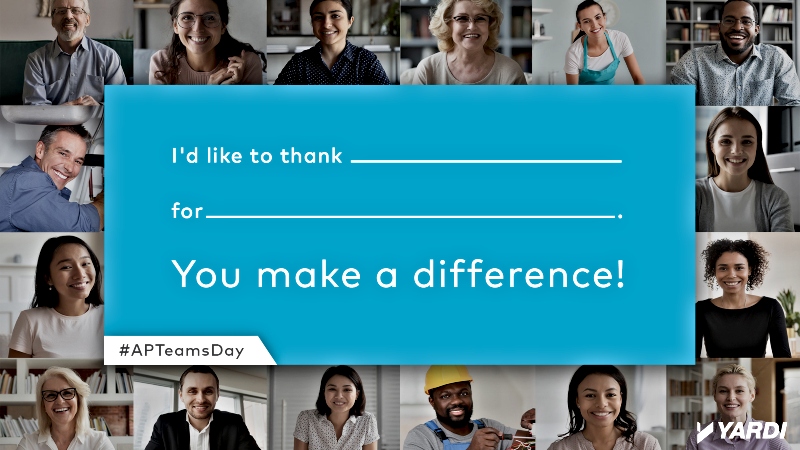 If you too would like to give thanks, you can screenshot the graphic below courtesy of Yardi, our sister company. Fill it out and simply post it on your preferred social media platforms with the official hashtag #APTeamsDay. Or, feel free to honor professionals who have been there for us and kept our homes safe by posting pictures, videos and other messages applauding their efforts.