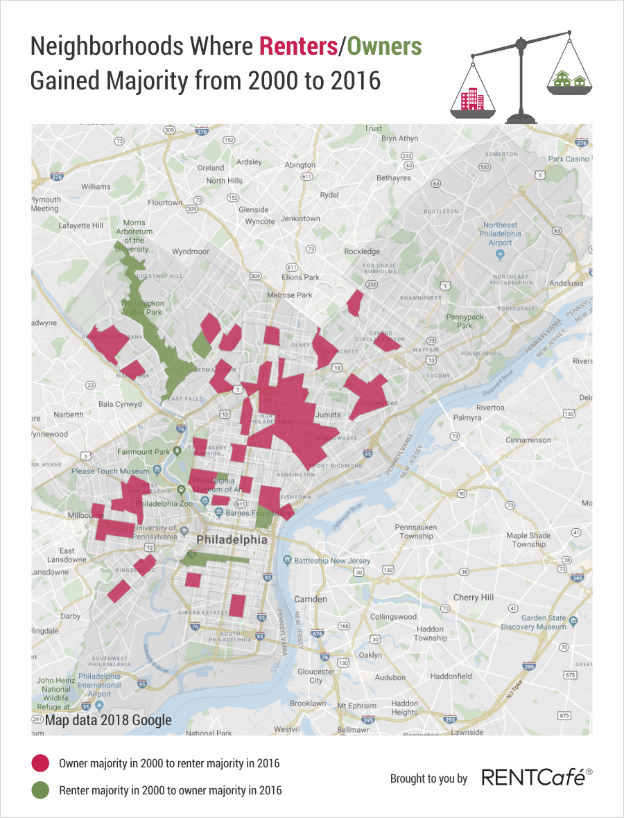- In our study we have compared the number of people living in renter- and owner-occupied units in 2000 and 2016 in census tracts inside Philadelphia’s city borders.